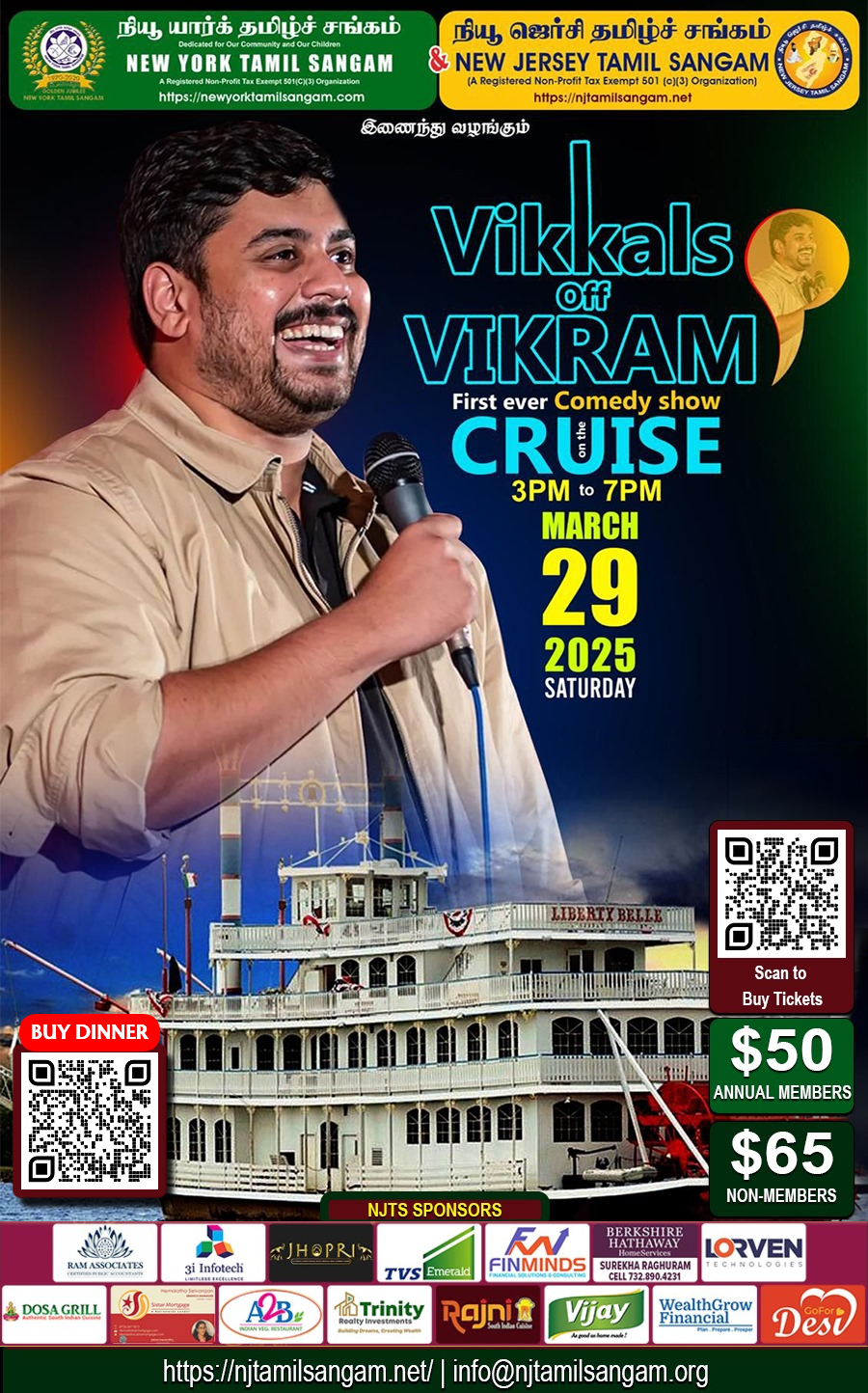 Join us for a 90-minute comedy show presented by the New York Tamil Sangam and New Jersey Tamil Sangam! Enjoy a fun-filled cruise featuring Vikram’s Comedy Show on March 29th, 2025, from 3 PM to 7 PM. This event is suitable for ages 13 and up. Don’t miss out on an afternoon of laughter and entertainment!